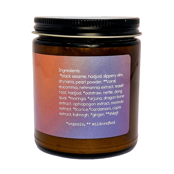 Bone Renewal is a small-batch herbal mineral blend crafted by Bliss Energetics. It combines organic and wildcrafted botanicals — including sesame, pearl, coral, and shilajit — inspired by Chinese, Ayurvedic, and Western traditions. Designed as a mineral-rich tonic, it’s made to be enjoyed as part of a simple daily ritual.