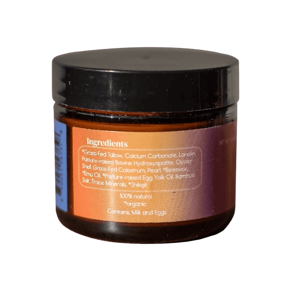 It combines bioavailable bovine hydroxyapatite from grass-fed New Zealand cattle with minerals such as bamboo salt, calcium carbonate, pearl, oyster shell, colostrum, and shilajit. These are blended into a nourishing base of grass-fed tallow, lanolin, and oils naturally containing fat-soluble vitamins.