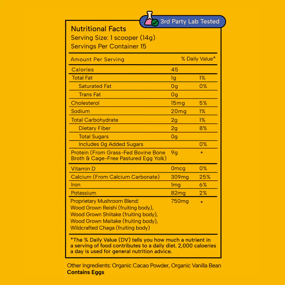 Each scoop is blended with Reishi, Shiitake, Maitake, and Chaga mushrooms for gentle, everyday support — making it one of the simplest, most nourishing ways to steady energy, calm tummies, and fuel growing bodies.